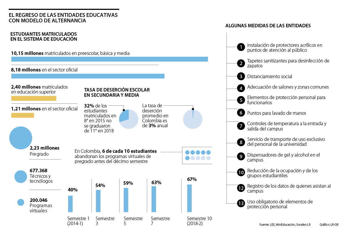 Con el fin de conocer cómo se están preparando las instituciones para volver a la presencialidad, se consultó a 10 rectores de colegios y universidades, pues como bien lo dijo Juan Luis Mejía, rector de la universidad Eafit, no se pueden quedar solo en la virtualidad, pues esta es un complemento, pero no un sustituto de los salones de clase.