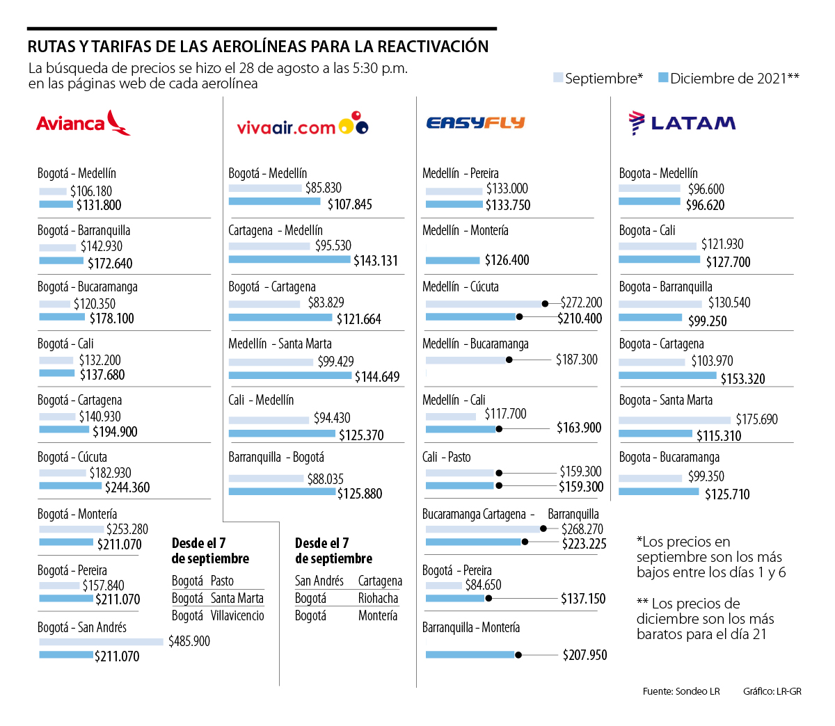 En esta primera fase, Avianca reanudará su operación con 14 rutas, Viva Air con 9, Latam con ocho, EasyFly con 10 y Wingo con una. Además, todas hacen promociones para recuperar la demanda, que se espera vuelva a tiempos precovid a finales de 2021. Igualmente, las empresas indicaron que de este factor depende que se aumenten las frecuencias entre destinos.