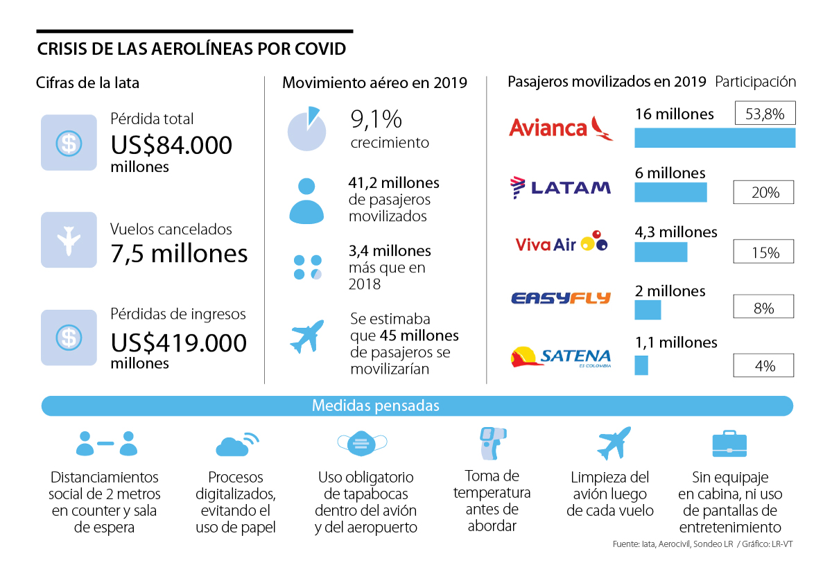 “El servicio a bordo inicialmente en vuelos nacionales se limitará a agua a demanda para evitar el contacto. Como vemos las cosas, tampoco se permitiría el equipaje de mano”, expresó Laverde.