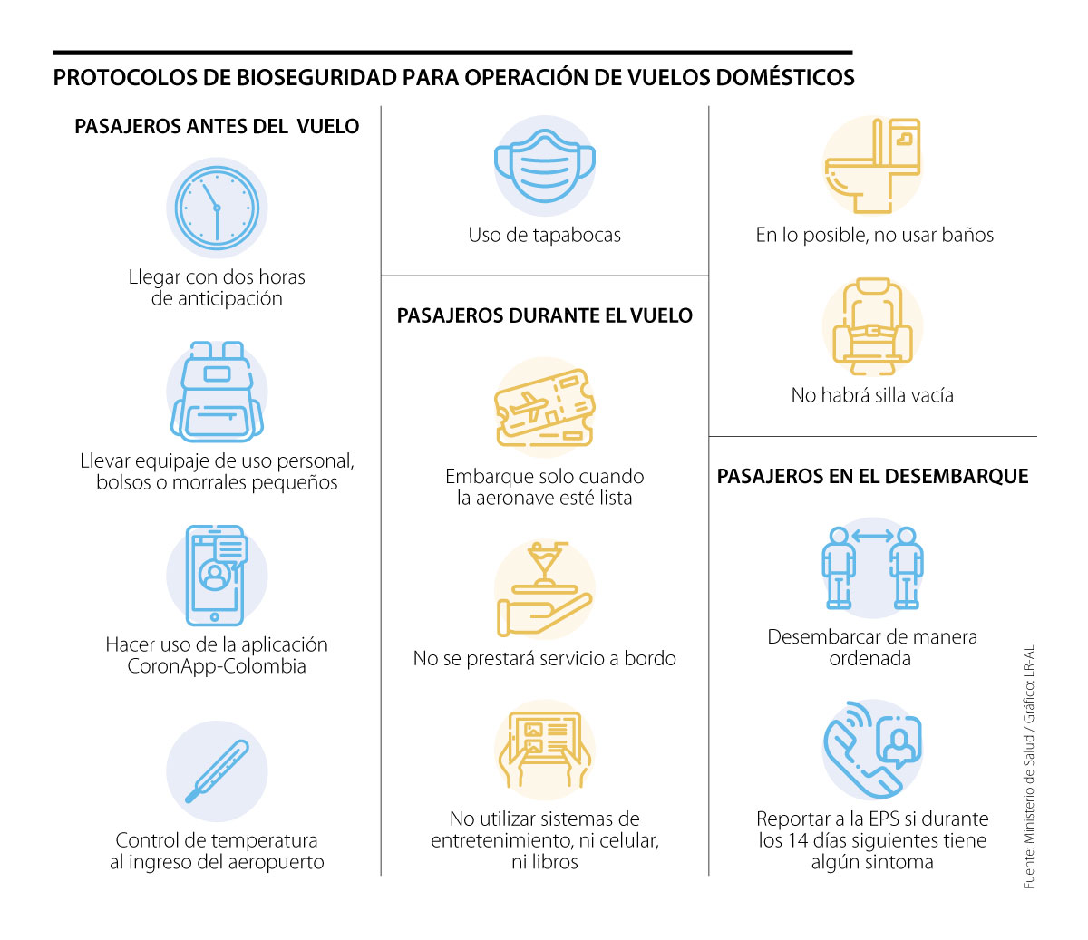 Si bien las aerolíneas y la Aerocivil ya habían dado pistas de cuáles serían las medidas para viajar, ayer el Ministerio de Salud y el de Transporte dieron a conocer los protocolos de bioseguridad que se implementarán en el mercado doméstico una vez se abran los cielos. Los viajes a nivel nacional en la “nueva normalidad” serán más demorados, pues desde la llegada al aeropuerto, pasando por el embarque del avión, el viaje y hasta en la salida del terminal de destino se debe cumplir con las medidas de bioseguridad.