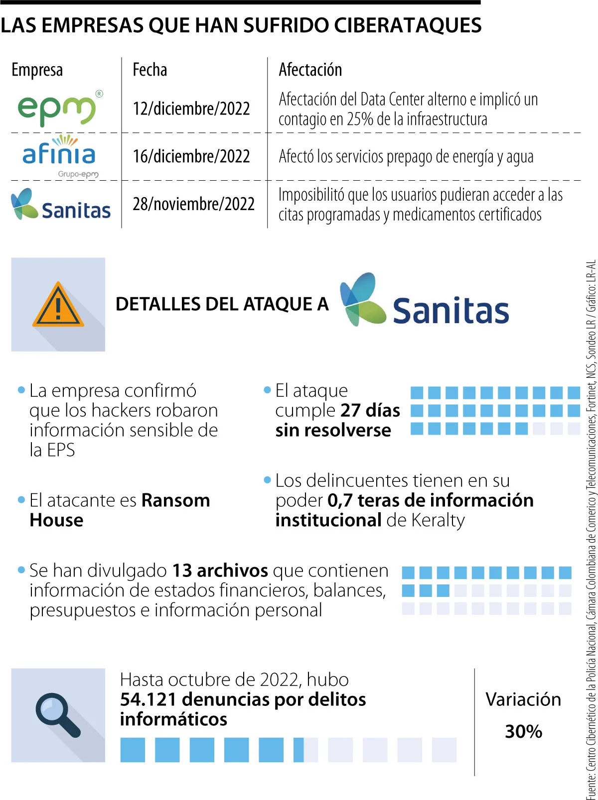 La primera fue Sanitas, que sufrió el ataque el 28 de noviembre. Esto quiere decir que, desde hace más de un mes, las tres empresas se encuentran con aspectos de su operación bajo el control de ciberdelincuentes, pues ninguna dio reporte de haber retomado el control total del sistema. EPM lo reportó el 12 de diciembre y Afinia el 16 del mismo mes.