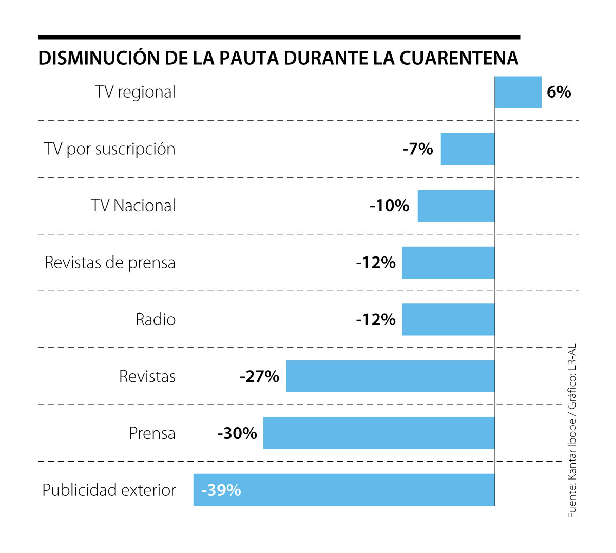 En pauta por sectores, el agropecuario crece 70%; higiene doméstica crece 27%; salud y deportes, 19%; farmacéutico, 6%; tecnología, 5%; servicios, 5%; y telecomunicaciones está creciendo 3%. Entre los que se han contraído, construcción cayó 39%; el automotriz, 34%; apuestas y loterías, 26%; diversión y entretenimiento, 21%; comercio y turismo, 21%; higiene personal y belleza, 16%; y educación, 10%.