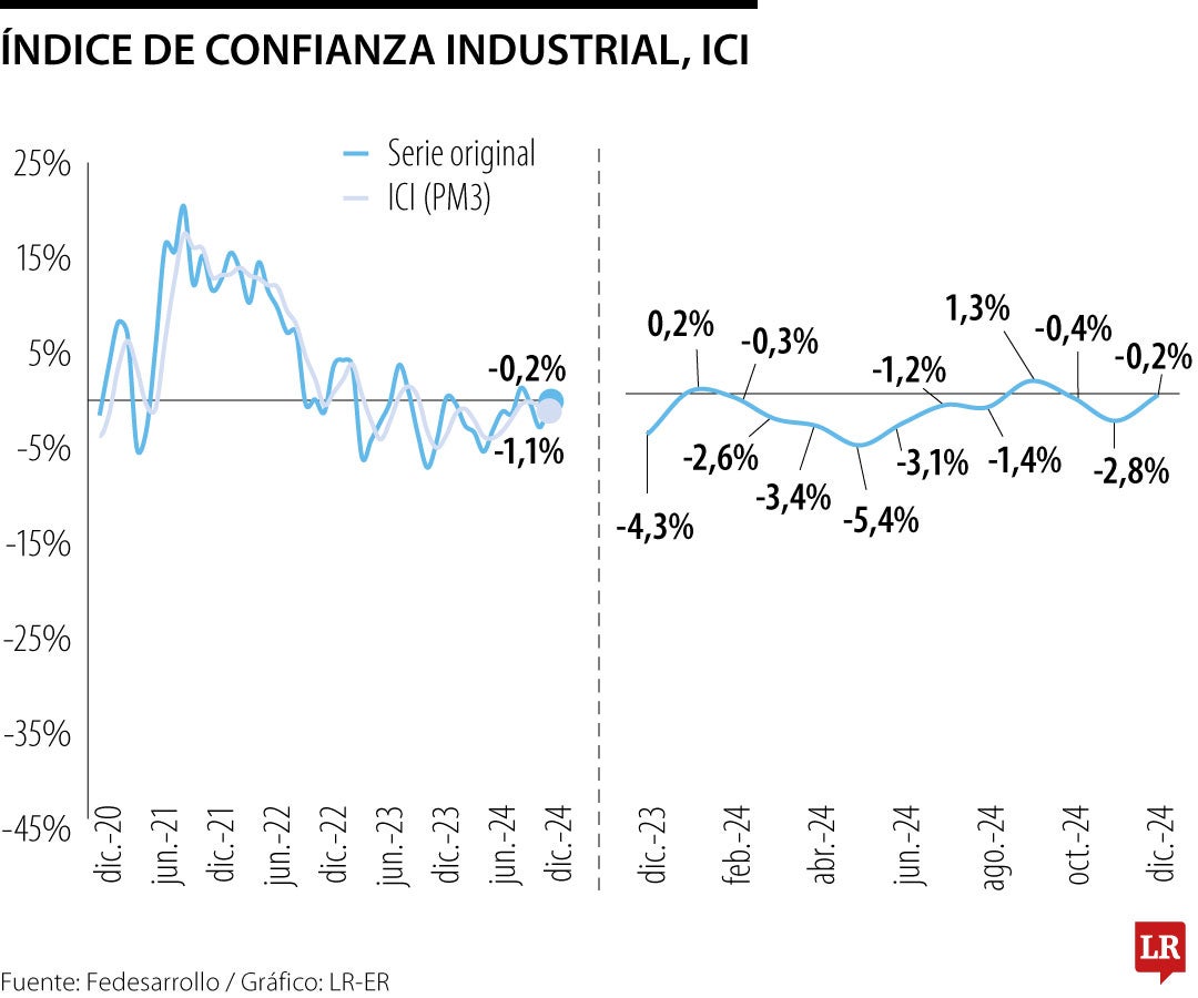 Para diciembre, el Índice de Confianza Industrial se ubicó en -0,2%, lo que representó un aumento de 2,6 puntos frente a noviembre de 2024