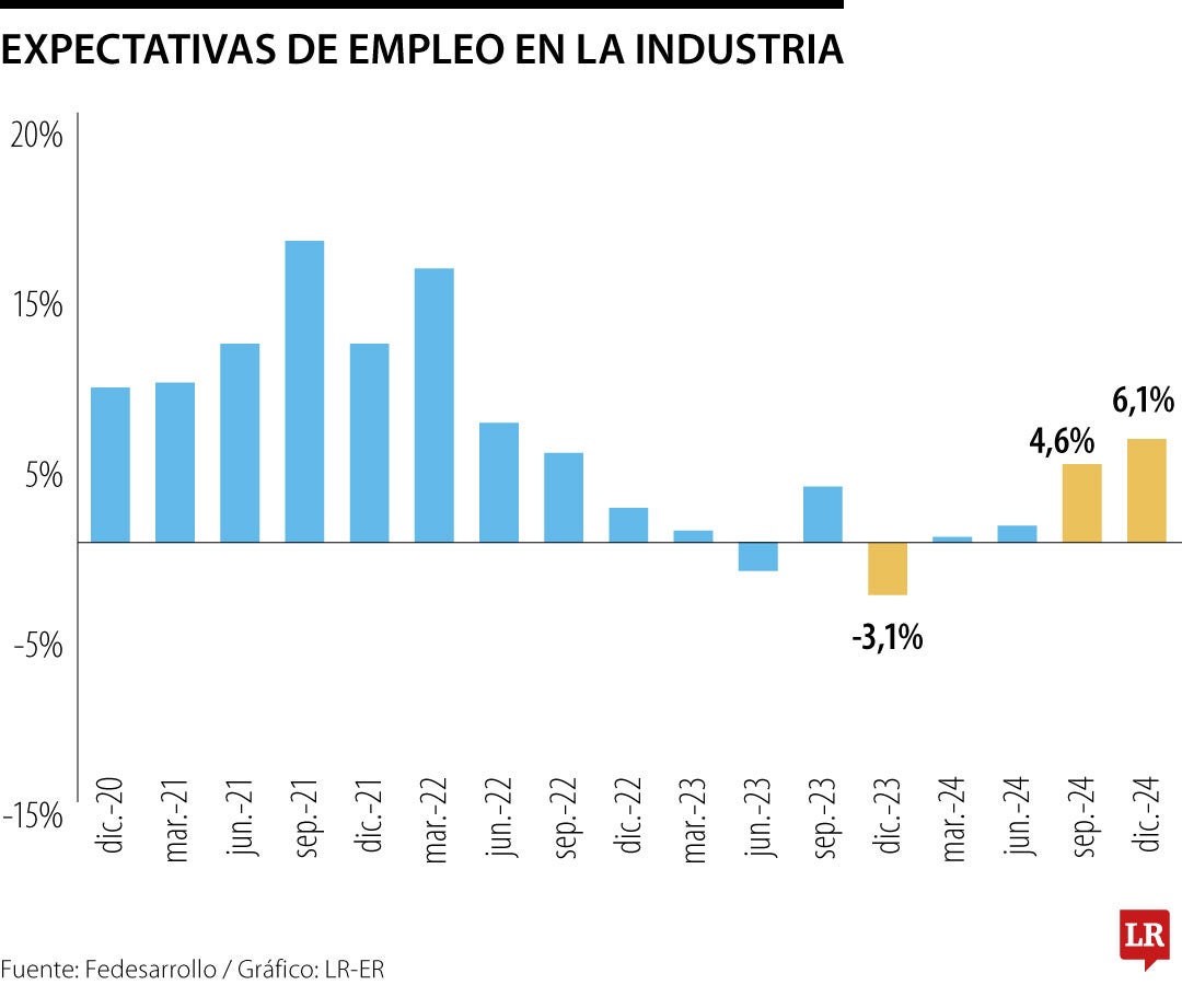 En cuanto a las expectativas en la generación de empleo del sector industrial para el tercer trimestre, estas aumentaron 1,5 puntos frente al trimestre entre julio y septiembre, llegando a 6,1%. También, hubo un alza de 9,2 puntos respecto al mismo trimestre de 2023, periodo que registró -3,1%.