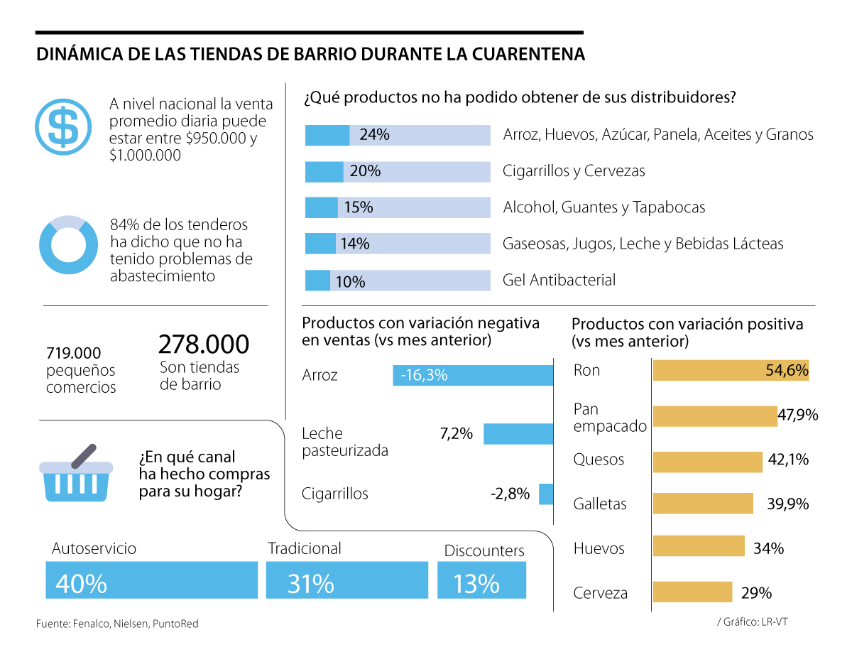 De acuerdo con datos de Fenalco, en el país hay 719.000 pequeños comercios, de los cuales 278.000 son tiendas de barrio, que, debido a la coyuntura, se han convertido uno de los principales canales de abastecimiento de los colombianos.