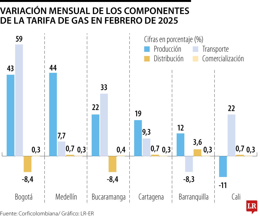 Corficolombiana señaló que el precio del gas registró el mayor incremento mensual del que se tiene registro; aun así, el impacto no fue igual en todas las regiones. Mientras en Bogotá y Neiva el precio aumentó en 20%, en Cali y Cúcuta no se registraron alzas.