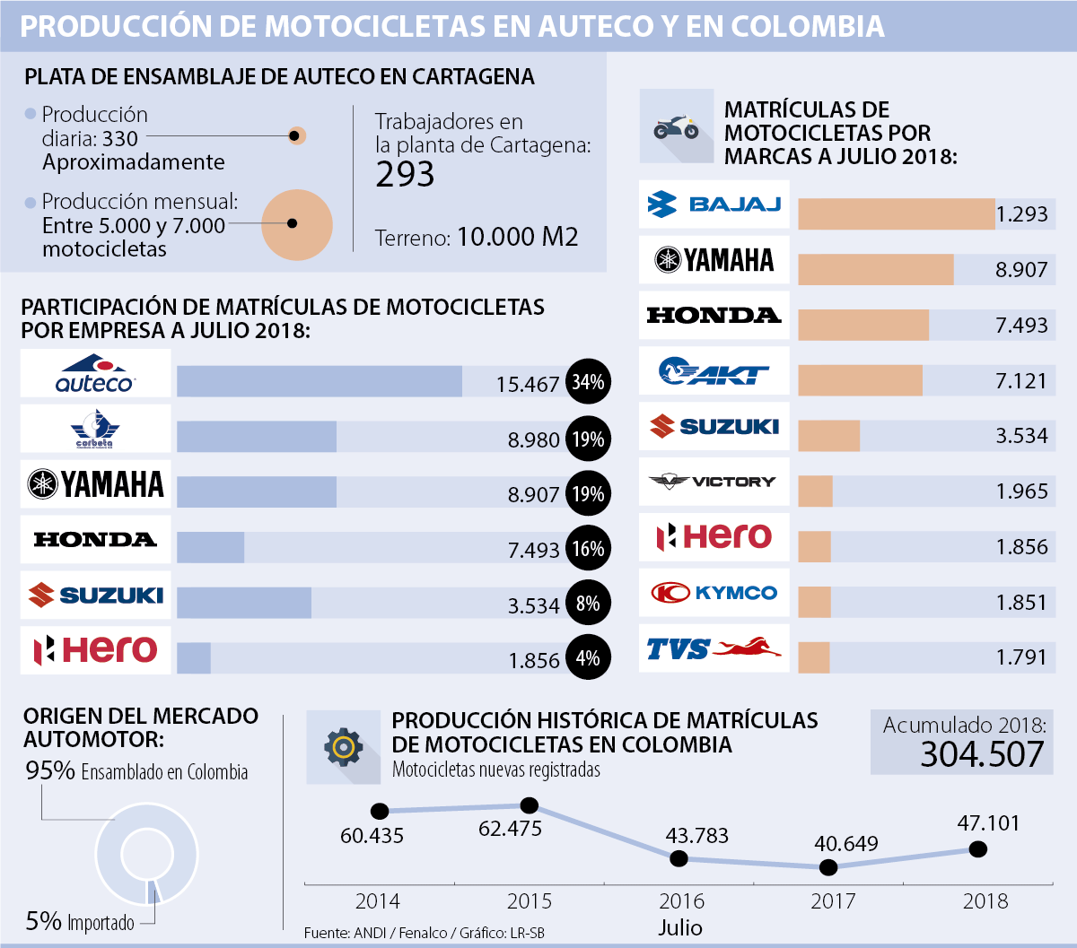 La ensambladora de motocicletas Auteco cuenta con dos plantas ensambladoras en el país: una en Itagüí y otra en Cartagena. Con esta infraestructura y cinco marcas de motos (Bajaj, Kymco, Kawasaki, KTM y Victory) la compañía lidera el mercado nacional con una participación de 34% del mercado, según cifras de Andi y Fenalco a julio de este año.