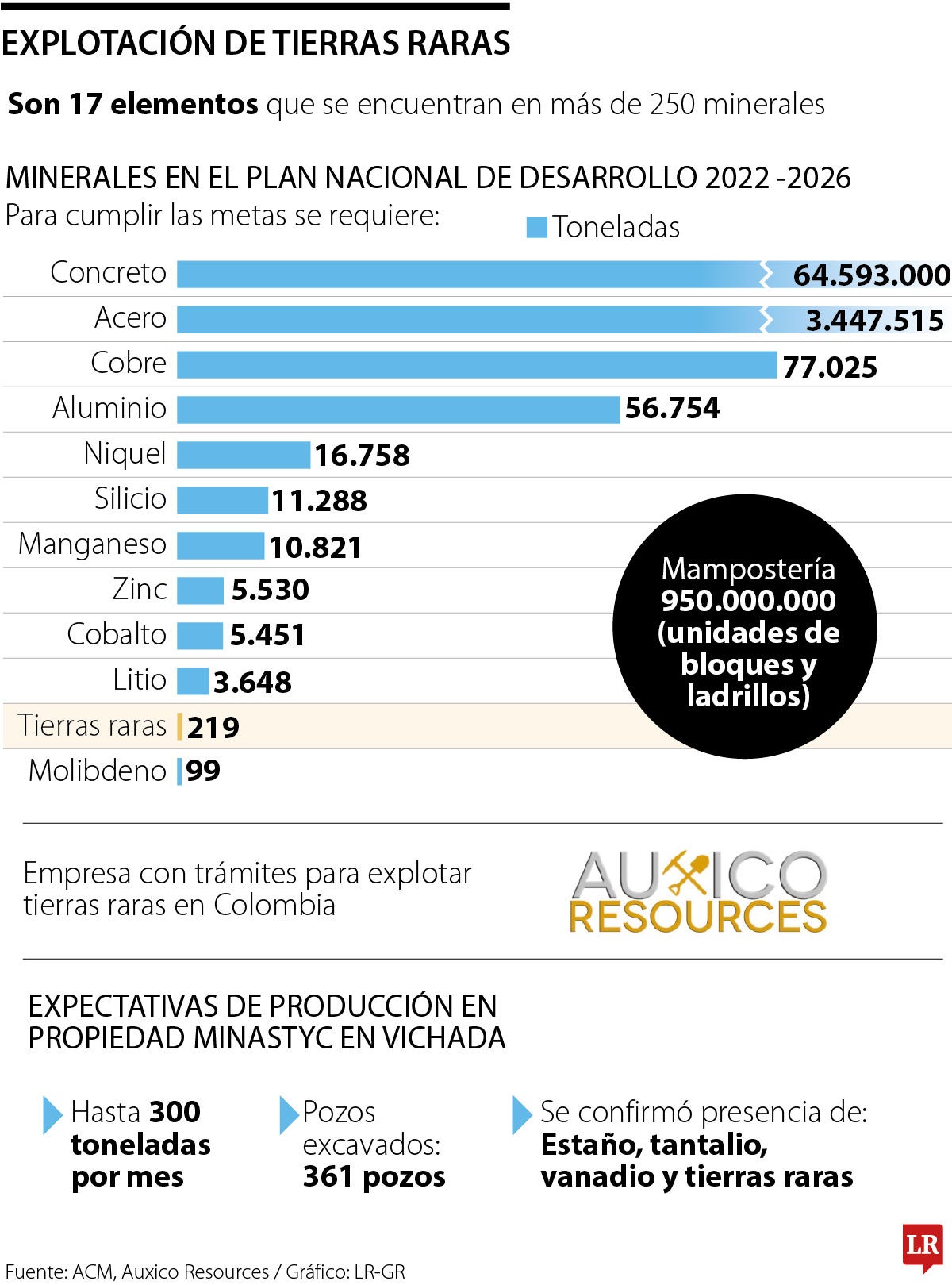 Con esta línea, la Asociación Colombiana de Minería, ACM, estimó que para cumplir el Plan Nacional de Desarrollo 2022 - 2026 se requiere 219 toneladas de tierras raras, pero a la fecha, el proyecto más adelantado, todavía no está produciendo.