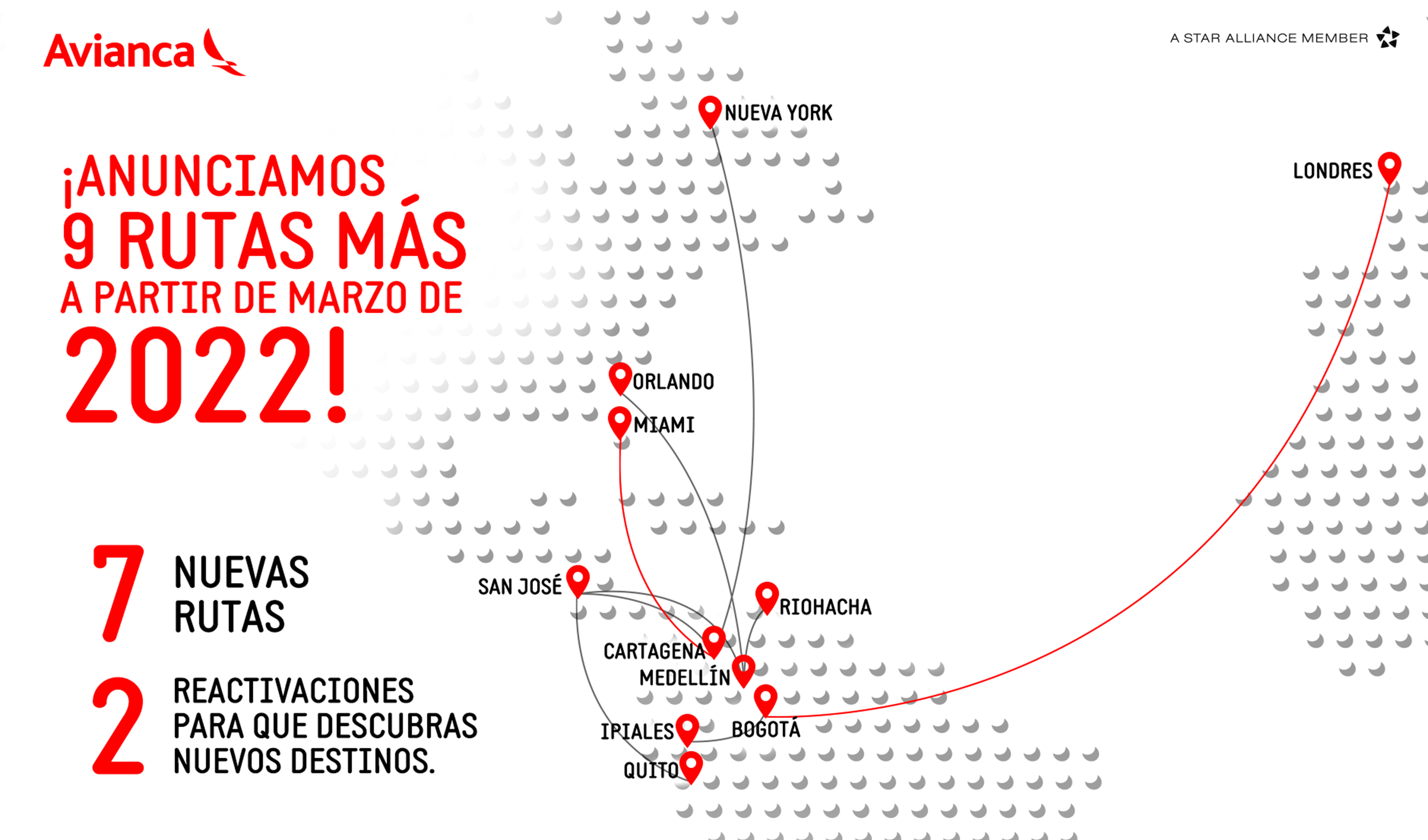 Luego de inaugurar 17 nuevas rutas con excelente comportamiento durante 2021, Avianca anunció siete rutas nuevas y la reactivación de dos más a partir de marzo de 2022 para que sus clientes viajen de manera directa y sin escalas desde Colombia y Costa Rica hacia destinos de Estados Unidos, Reino Unido y Ecuador.