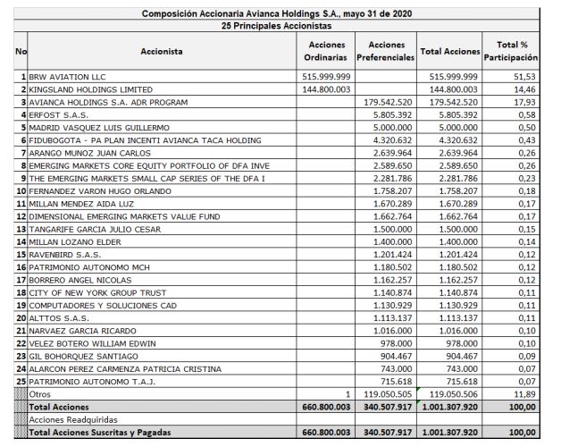 La compañía Avianca Holdings, liderada por Anko Van der Werff, informó mediante un comunicado a la Superintendencia Financiera que, conforme al libro de Registro de acciones ordinarias y la información recibida del Depósito Centralizado de Valores de Colombia, la composición ordinaria al 31 de mayo de la empresa era liderado por BRW Aviation, con una participación de 51,53%.