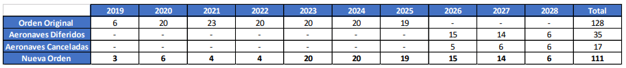 Además, la Compañía también canceló la entrega de 17 aeronaves A320neo de la orden de compra firmada en 2015. De acuerdo a lo revelado por la firma, "este acuerdo reducirá las necesidades de capex de flota de la compañía en más de US$350 millones en los próximos tres años y reducirá las obligaciones financieras futuras para los años 2020 - 2022 en más de US$ 2.6 billones".