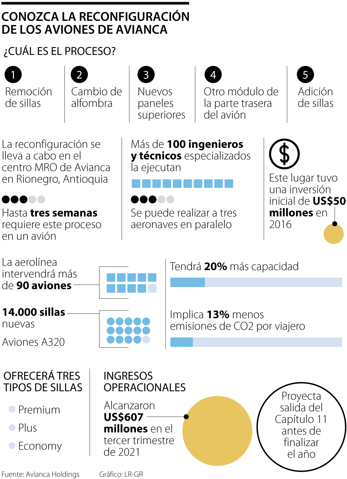 La propuesta de la aerolínea consiste en la oferta de tres tipos de sillas (economy, plus y premium) con precios competitivos, consolidando el proyecto ‘Vuela a Tu Medida’; y proyecta finalizar 2021 operando 13 aviones con por lo menos dos de estos asientos. En total, la compañía intervendrá más de 90 aeronaves, razón por la cual la instalación de 14.000 sillas y del nuevo espacio de baños en los A320, tardará hasta finales de 2022.