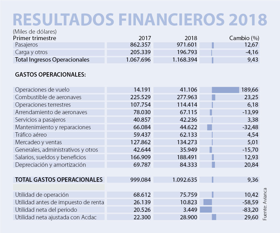 Avianca entregó sus resultados financieros correspondientes al primer trimestre del año. En estos, la compañía informó que durante este periodo había obtenido ingresos de US$1.168,39 millones, cifra que para el primer trimestre de 2017 había sido de US$1.067,70 millones, lo que representó un incremento de 9,4% los tres primeros meses de este año.