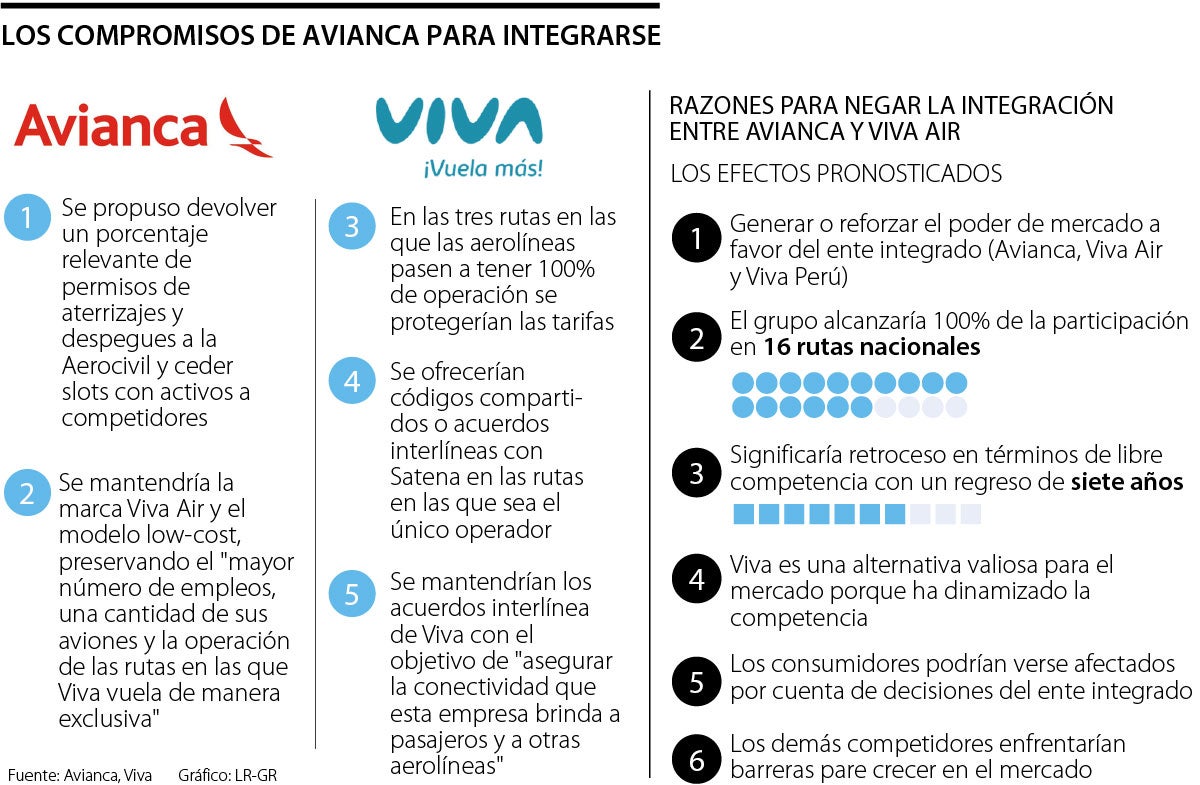 Avianca también ha asegurado que mantendría la marca Viva Air y el modelo low-cost, y que se compromete a preservar el “mayor número de empleos, una cantidad de sus aviones y la operación de las rutas en las que Viva vuela de manera exclusiva”. Así mismo, en las tres rutas en las que las aerolíneas pasen a tener 100% de operación se protegerían las tarifas. Valga señalar que la Aerocivil había dicho que tendrían 100% de operación en 16 rutas, como parte de sus argumentos para objetar la integración.