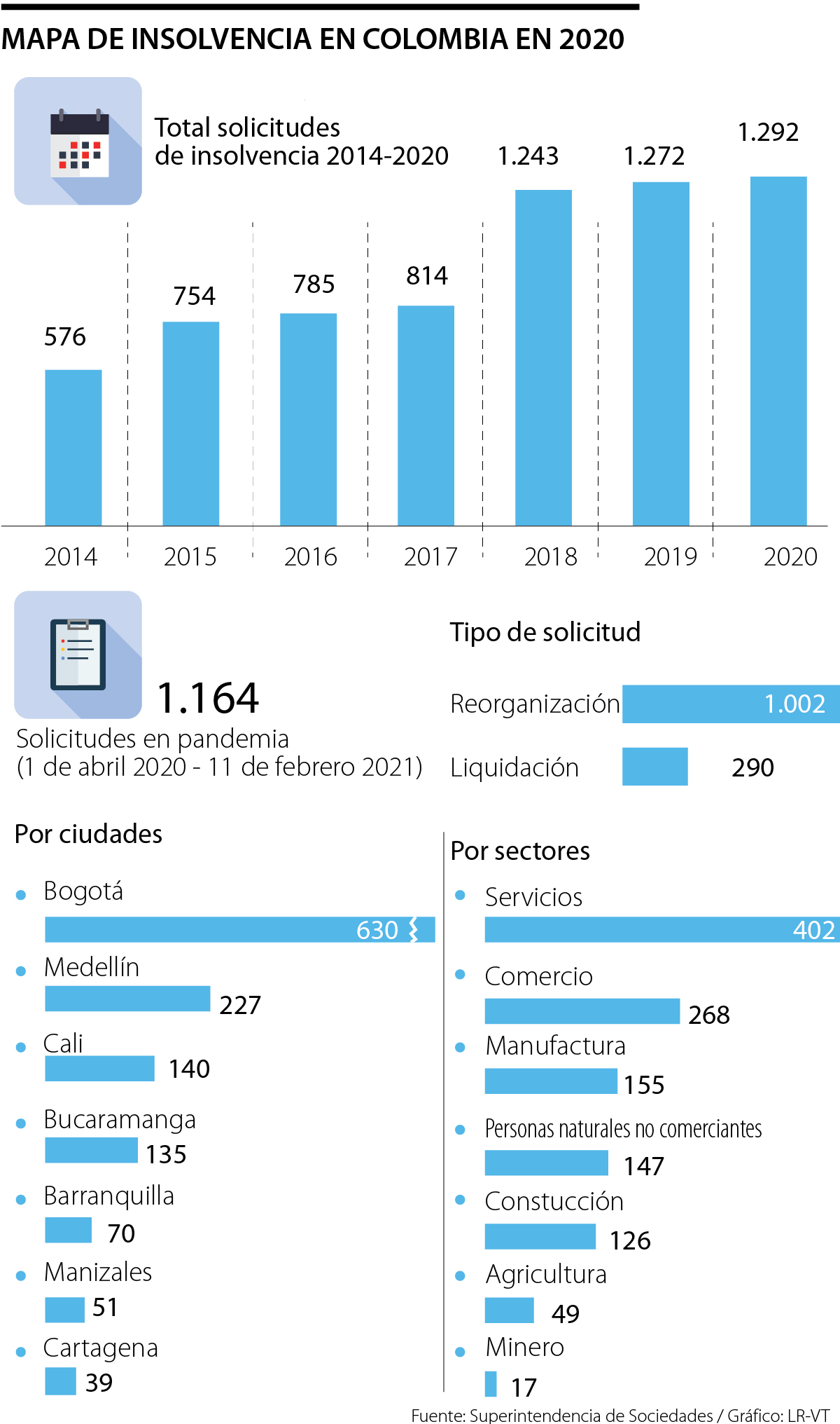 En 2020 se presentaron 1.292 solicitudes de insolvencia, un incremento de 2%. Del total, 1.002 fueron para reorganización y 290 liquidación