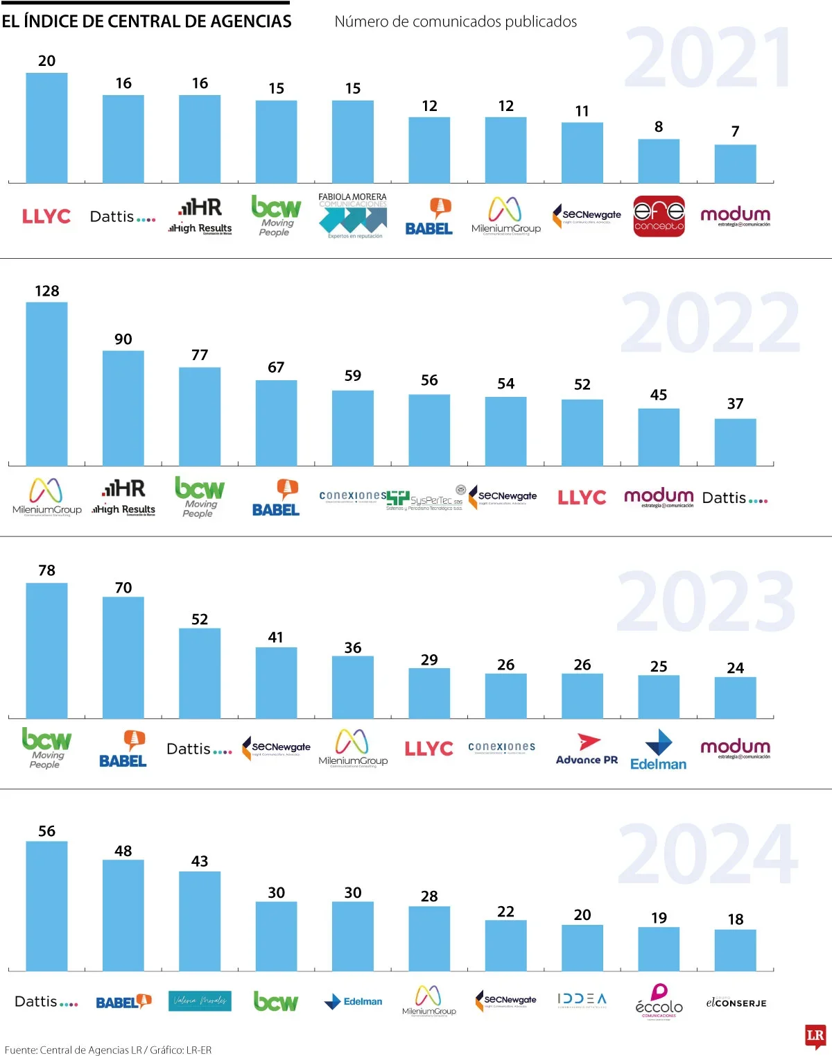 En el índice de central de agencias de 2024 las que ocuparon el top 10 de acuerdo al ranking de mayor cantidad de comunicados de prensa publicados fueron Dattis (56),Babel Group (48), Valeria Morales Comunicaciones (43), Bcw (30), Edelman (30), Milenium Group (28), SECNewgate (22), Iddea Comunicaciones (20) Éccolo Comunicaciones (19) y Grupo El Conserje con 18.