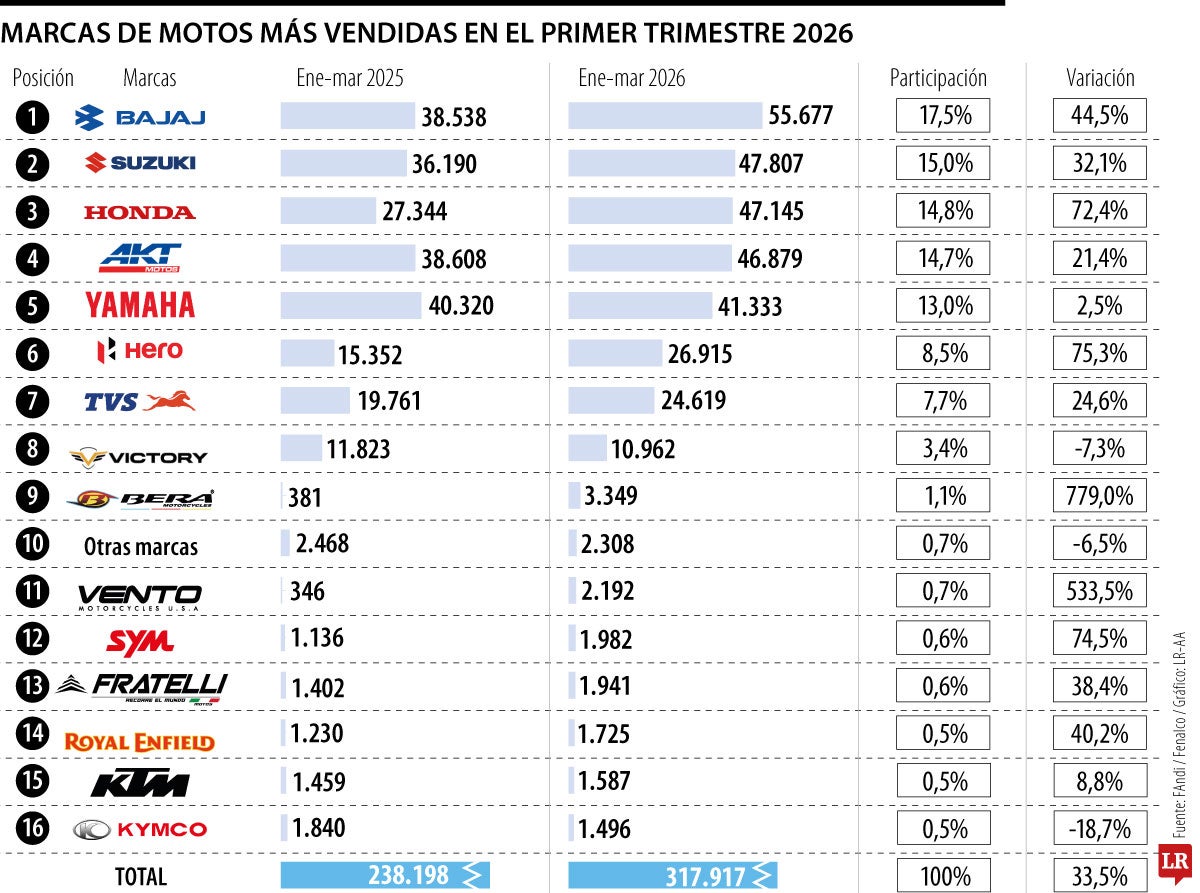 En cuanto al balance de otras marcas, las cifras de los primeros tres meses del año revelan que TVS vendió 24.619 motocicletas nuevas, 24,6% que en el mismo periodo en 2025, cuando comercializó 1.402; y Fratelli registró 19.761 unidades, 38,4% que durante el primer trimestre del año pasado (1.402).