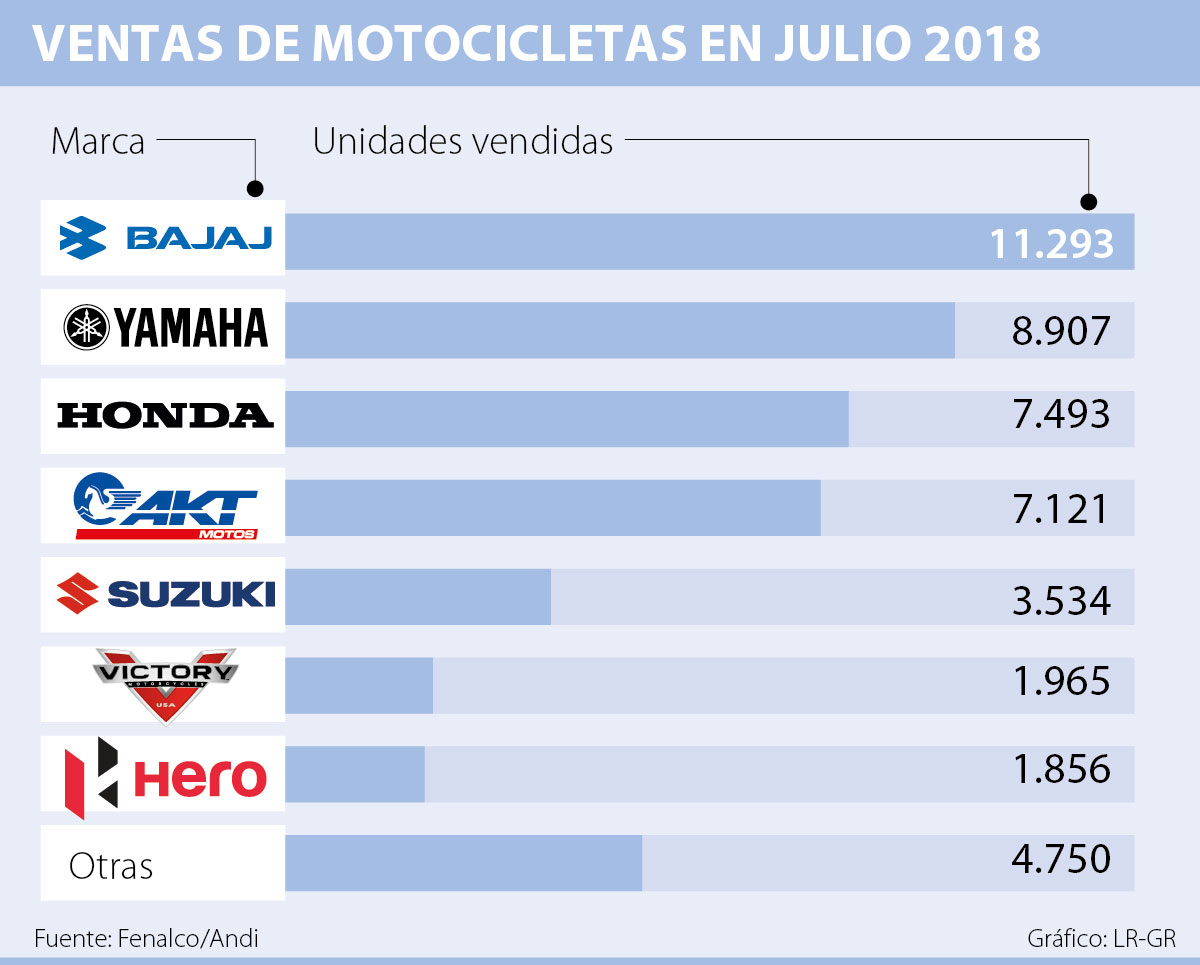“Auteco con las marcas Bajaj, Kymco, Kawasaki, KTM y Victory mantiene el primer puesto, y pasa de 34,1% a 33,4%; AKT con las marcas AKT, TVS y Royal Enfied, obtiene el segundo puesto al pasar de 16,3% a 19,4%; Incolmotos -Yamaha pasa al tercer lugar, con 19,2% de participación; Fanalca-Honda ocupa el cuarto lugar pasando de 16,7% a 16,2%; Suzuki tiene 7,6% de participación y Hero obtuvo un 4% de participación en el mercado”, explicaron.