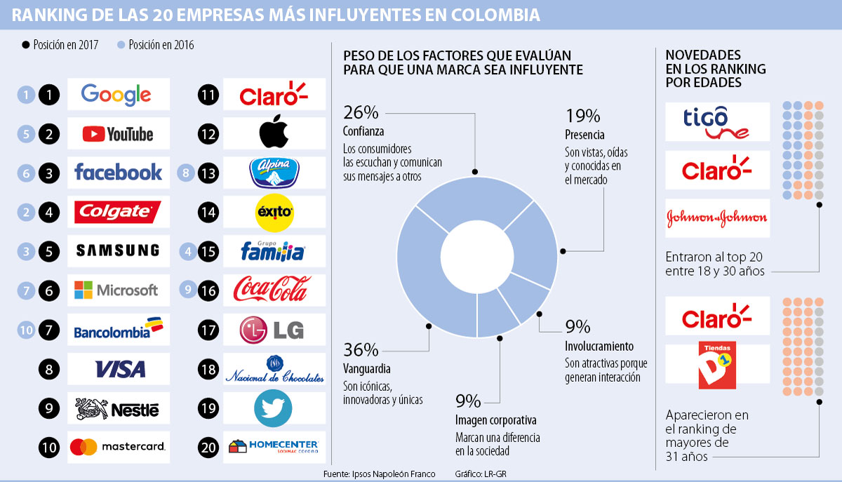 María Paula Molina, directora de Marketing de Ipsos, rescató que el ranking (que en esta versión midió a 100 compañías colombianas y se aplicó a 21 países del mundo), tuvo en cuenta el desempeño de las compañías en cinco aspectos para listar a las más influyentes de 2017. Y fueron los siguientes: vanguardia (marcas icónicas, innovadoras y únicas); confianza (empresas a las que los consumidores escuchan y luego comunican sus mensajes a otros); presencia (compañías que son vistas, oídas y conocidas); imagen corporativa (organizaciones que marcan la diferencia en la sociedad); e involucramiento, es decir, corporaciones que son atractivas porque generan interacción.