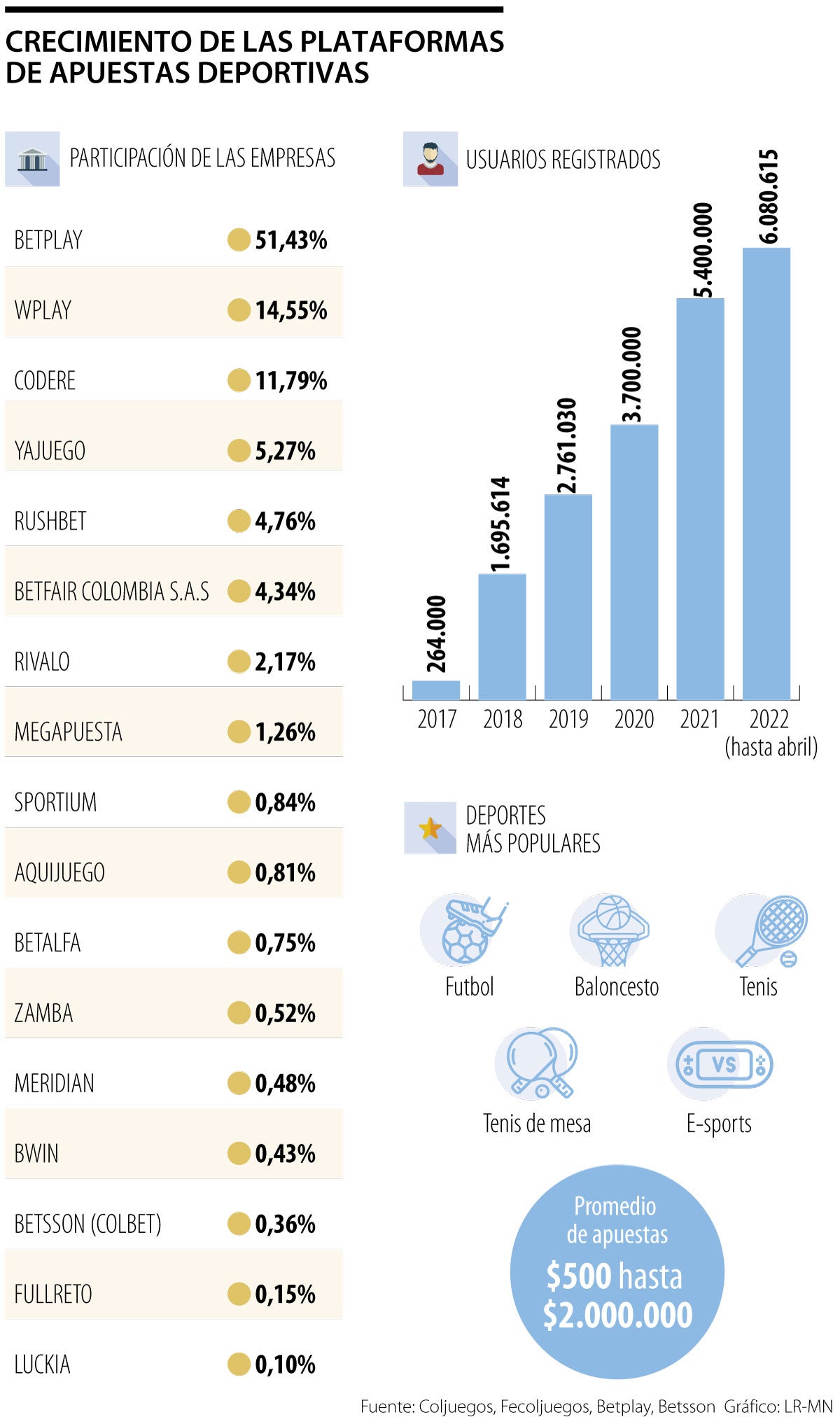 En este portafolio de deportes se evidencia que los que más tienen niveles de apuestas son el fútbol, seguido de baloncesto, tenis, tenis de mesa y e-sports. Aquí, los usuarios pueden hacer apuestas por montos entre $500 y $2 millones.