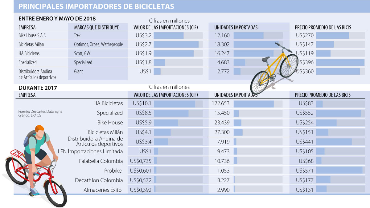 Pero gran parte de las ventas del sector se deben a las importaciones, pues principalmente desde Europa y Estados Unidos, el año pasado llegaron 290.000 unidades, lo que arma otro ranking de las empresas que son líderes en importaciones. Allí, según el último reporte del sector entregado por la consultora Descartes Datamyne, las empresas que más han traído referencias entre enero y mayo de 2018 son: Bike House, Bicicletas Milán y HA.