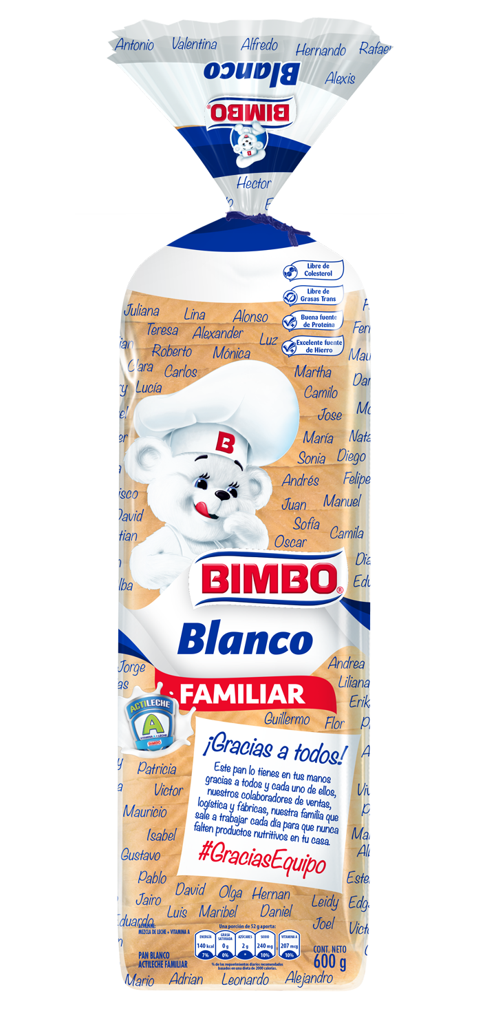 Bimbo Colombia rinde homenaje a sus colaboradores a través de la impresión de 3 millones de empaques del producto más icónico de la panificadora multinacional, el pan blanco de 600 gramos, con los nombres de los cerca de 4.000 trabajadores que durante la emergencia sanitaria han trabajado incansablemente para hacer posible el mantener productos frescos en la mesa de los colombianos, bajo los más altos estándares de calidad, inocuidad e higiene.