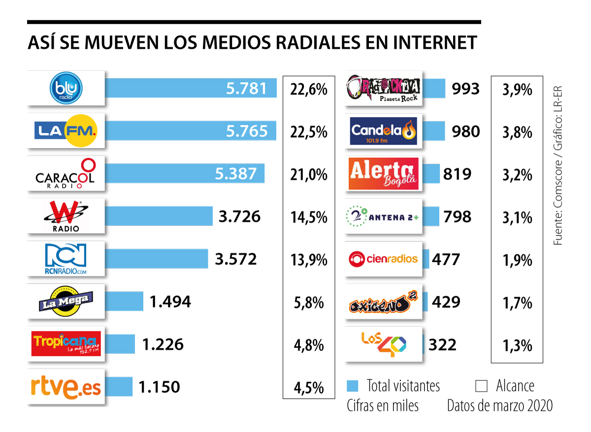 El más reciente estudio de Comscore mostró que la realidad del aumento de las audiencias digitales de los medios de comunicación también se está viendo en la radio en Colombia. Los resultados mostraron que en marzo, Blu Radio, con 5,7 millones de visitantes únicos y un alcance de 22,6% fue la líder. En segundo lugar, muy cerca, se encontró La FM, también con 5,7 millones de visitantes únicos y un alcance de 22,5%.