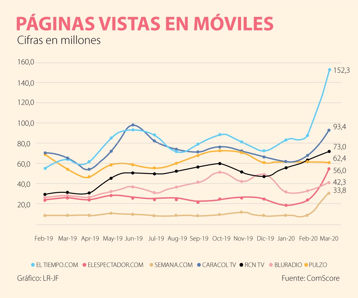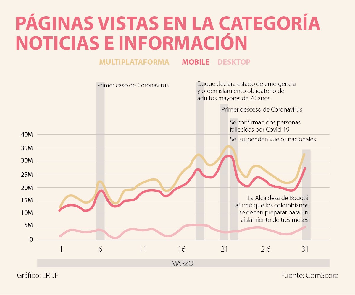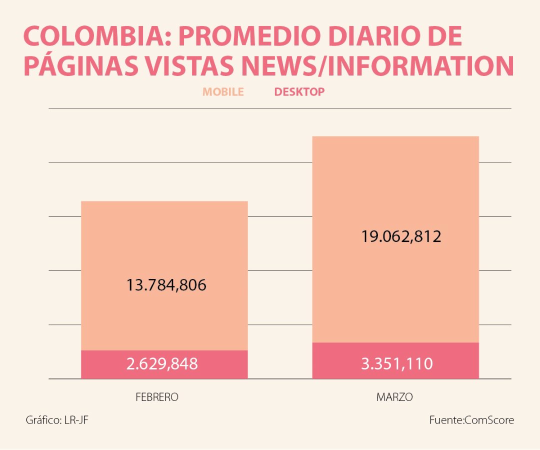 “Durante el mes de marzo de 2020, los sitios de noticias e información (de Colombia) registraron un incremento de páginas vistas en promedio de un 37%, donde los usuarios observaron aproximadamente 6 millones de páginas diarias más en comparación con el mes anterior (febrero)”, dice en un comunicado.