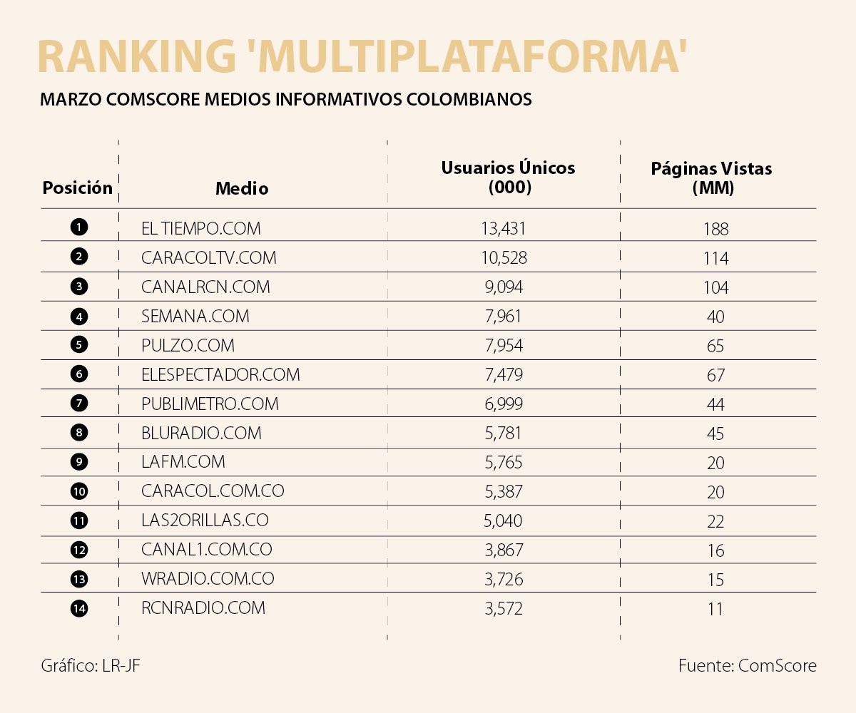 Nota: las cifras de El Tiempo no incluyen su red de portales, solo las de eltiempo.com. En el caso de Caracol TV, no se pudo confirmar si es cierto que incluyen otros portales del Grupo Santo Domingo, como Data IFX o Cine Colombia.