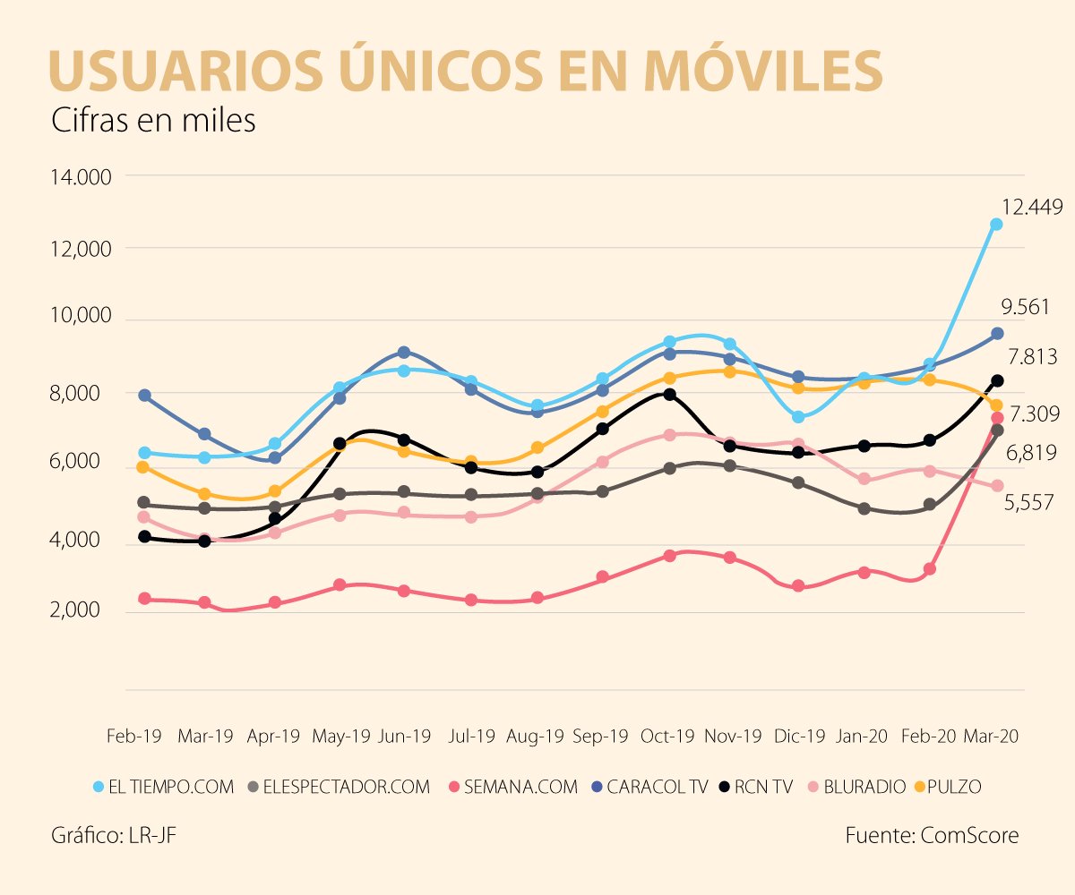 Al ver solo móviles, la mayor fuente de tráfico, El Tiempo registra en ComScore 12.479.000 usuarios únicos y 152.300.000 de páginas vistas; Caracol TV, 9.561.000 usuarios únicos y 93.400.000 páginas vistas; RCN, 8.447.000 usuarios únicos y 73.000.000 de páginas vistas; y Pulzo, 7.813.000 usuarios únicos 62.400.000 páginas vistas.