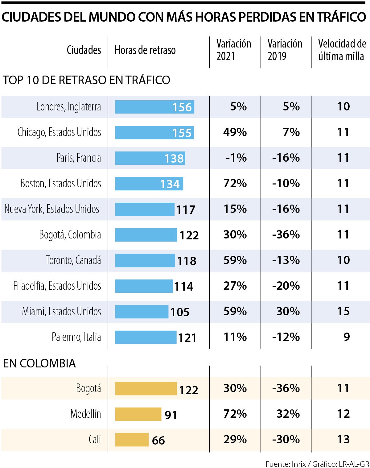 El índice global Inrix Global Traffic Scorecard 2022 reporta cada cuatro años un análisis de movilidad de las zonas más congestionadas en todo el mundo. Por ejemplo, el estudio publicó un listado de las ciudades del mundo en las que un conductor pierde más tiempo en medio del tráfico, en el cual Bogotá ocupa el sexto lugar, con retrasos de hasta 122 horas.