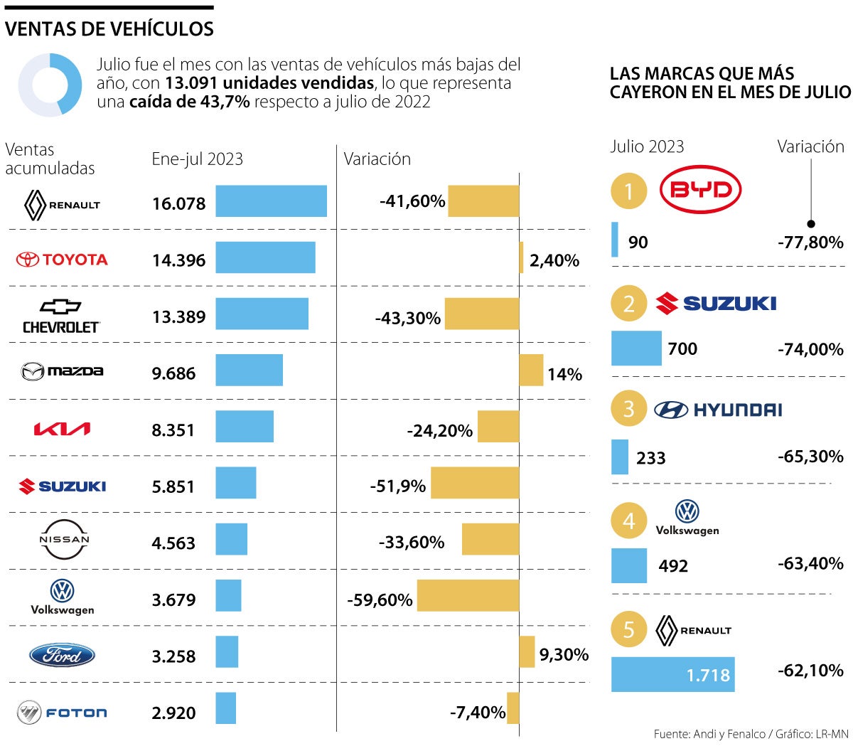 Así, las marcas que tuvieron una mayor contracción en las ventas del séptimo mes, y que, por ende, jalonaron más el indicador negativo, fueron BYD, con una caída de 77,8%, seguida de Suzuki, con -74,% y de tercer lugar está Hyundai, con una reducción de 65,30%. Los últimos puestos los ocupan Volkswagen, con 63,4% y Renault que tuvo disminución de 62,1%, a pesar que ocupó el tercer lugar en el número de unidades más vendidas en julio.