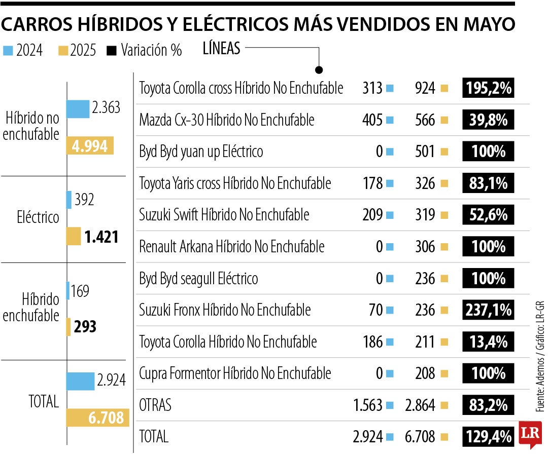 Mientras tanto, Toyota domina el mercado de los híbridos. La compañía japonesa ha vendido 8.263 carros en los que va de 2025, de los más de 33.000 vehículos nuevos en el país. Esto significó un crecimiento de 24,9% a nivel interanual.