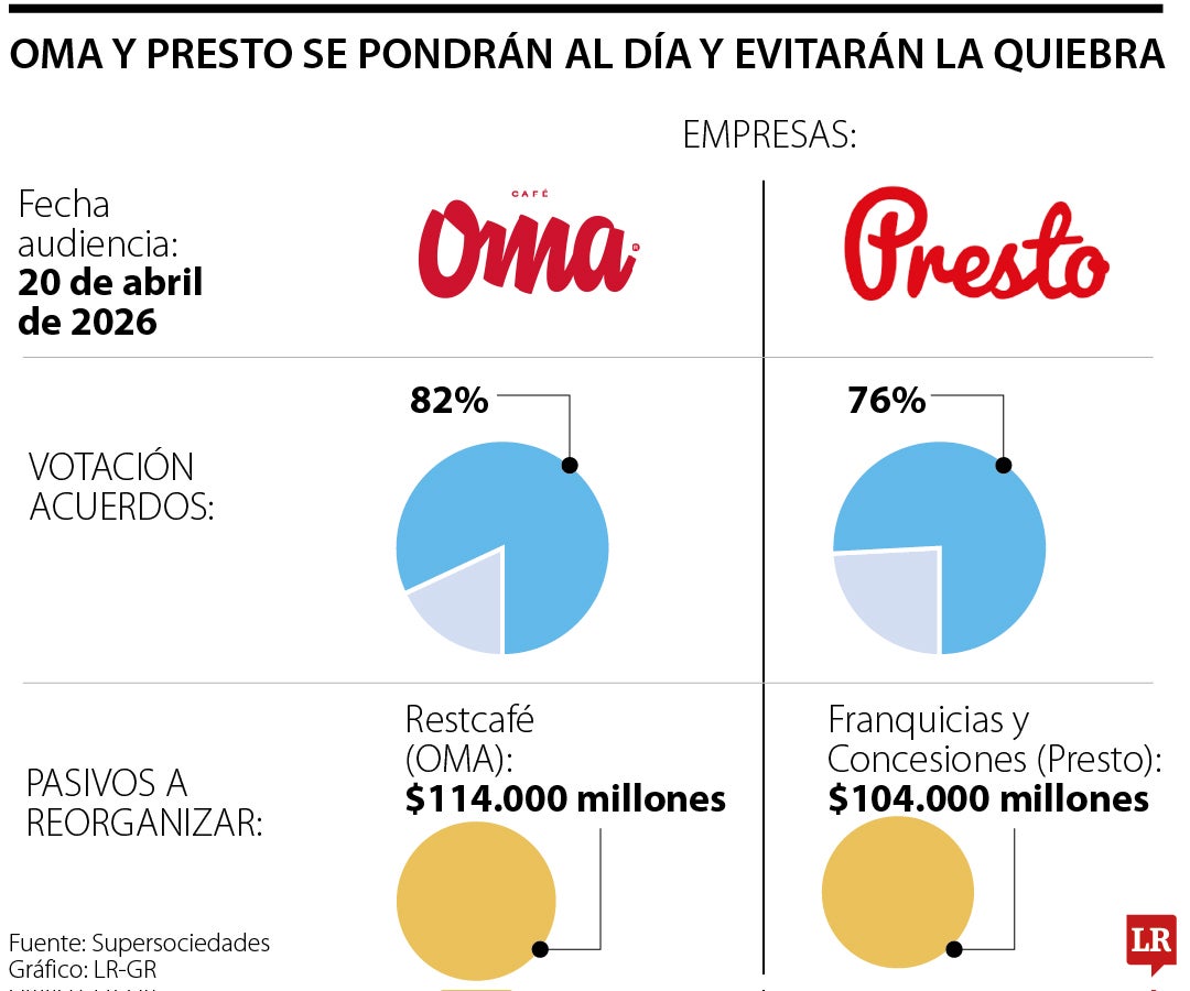 OMA y Presto entran en la recta final de su proceso de reorganización con el objetivo de ponerse al día con sus deudas y evitar la quiebra. En ese contexto, la Superintendencia de Sociedades convocó para el 20 de abril de 2026 la audiencia de confirmación de los acuerdos de Restcafé y Franquicias y Concesiones, compañías que operan estas marcas (OMA y Presto) en Colombia.