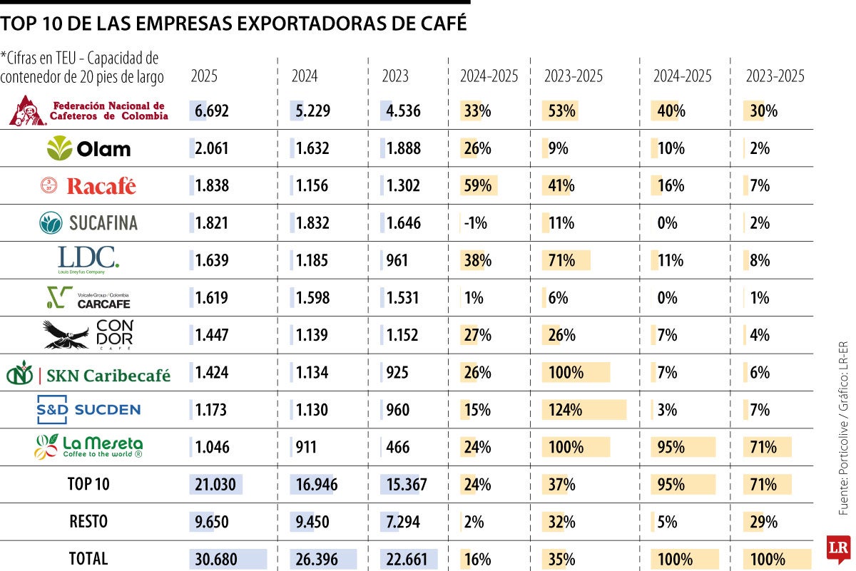 En los últimos dos años, las exportaciones de café han mostrado un dinamismo superior al de las exportaciones contenerizadas totales del país, consolidándose como uno de los productos líderes de la canasta exportadora colombiana. De hecho, la expansión de este grano explicó cerca del 21,5% del crecimiento total de las exportaciones en el período.