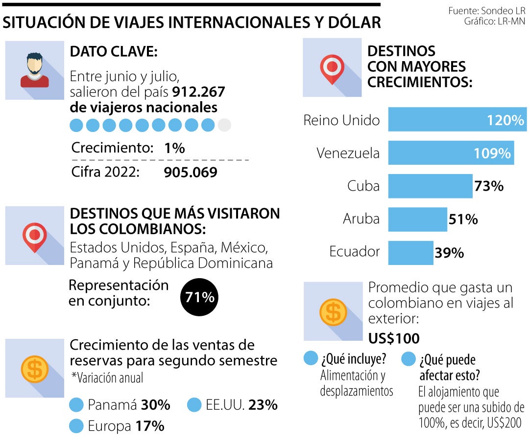 Ginna Cárdenas, gerente general de agencia Travel World Colombia, dijo que si el dólar siguiera a la baja, las reservas internacionales mejorarán, como ya está pasando. Cifras del sector mostraron que la demanda de paquetes turísticos reservados o pagados entre junio y la primera semana de agosto, para tomar vacaciones entre octubre y diciembre creció 35% respecto al año pasado. Entre las agencias reconocen el factor dólar porque "julio del año pasado comenzó con una TRM en $4.151 pero se fue elevando hasta el rango de $4.500 hasta $5.000".