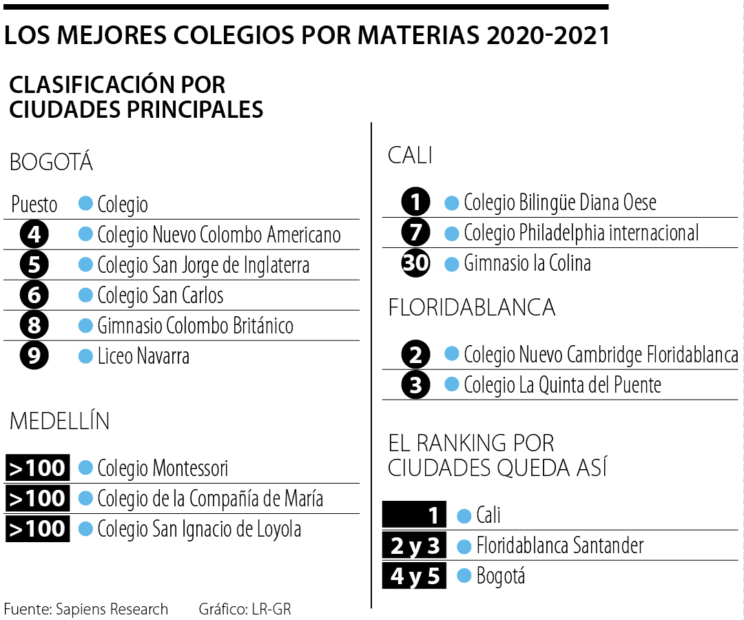 En la última actualización del ranking 100 Mejores Por Materias 2020-2021, que realiza Sapiens Research, se entregaron los resultados de los mejores colegios del país. En el listado las ciudades que más brillaron por alojar a las mejores instituciones educativas fueron Cali, Floridablanca y Bogotá, en orden de ranking.
