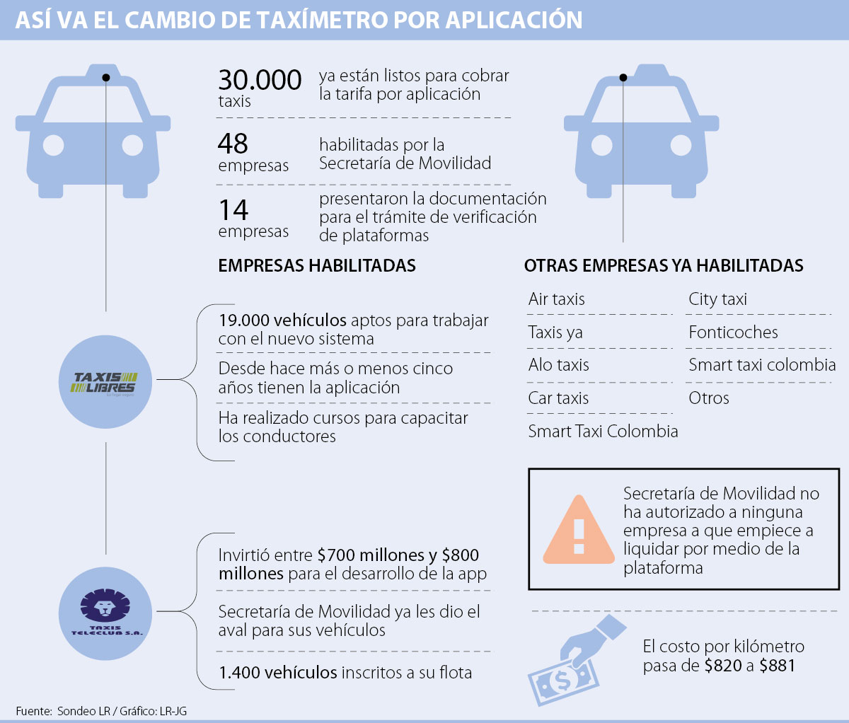 Pese a que en este momento la medida ha sido rechazada por las empresas de taxímetros, los gremios y los conductores; empresas como Teleclub, Tax Express, Taxis Libres, entre otras, ya cuentan con los requisitos para cobrar los servicios por “apps”.