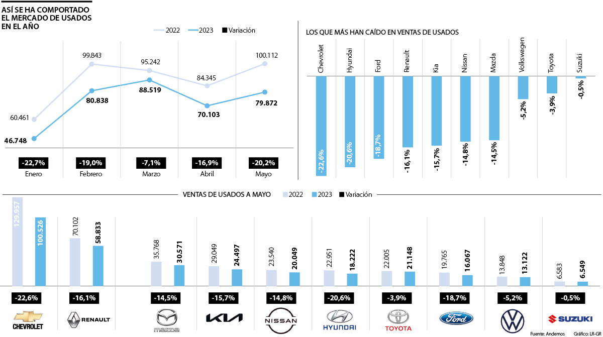 Lo hace con un total de 100.526 carros vendidos hasta mayo, que es 22,6% menos que en ese mismo periodo de 2022, cuando habían sido 129.957 vehículos. La segunda marca que más está vendiendo usados en medio de la caída del sector es Renault. La marca ha comercializado 58.833 unidades, que es 16,1% menos; le sigue Mazda, con 30.571 vehículos de segunda mano comercializados, y un desplome de 14,5%. En el cuarto lugar continúa Kia, que ha caído 15,7%, con 24.497 unidades comercializadas.