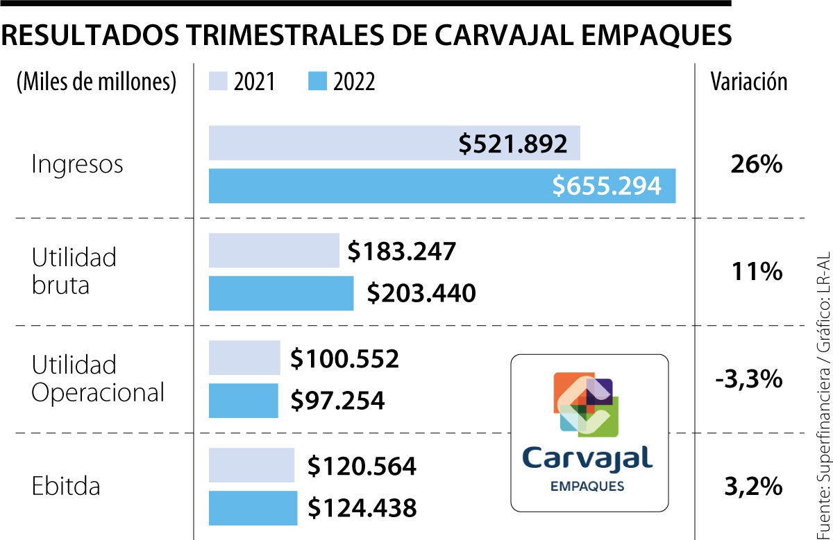 Carvajal Empaques indicó que para el tercer trimestre del año (julio-septiembre) sus ingresos crecieron a doble dígito por más de 26% en comparación con el mismo periodo de 2021. Según el informe de la Superintendencia Financiera, las ventas de la empresa alcanzaron $655.294 millones en este período cuando el año pasado estás habían sido de $521.892 millones.
