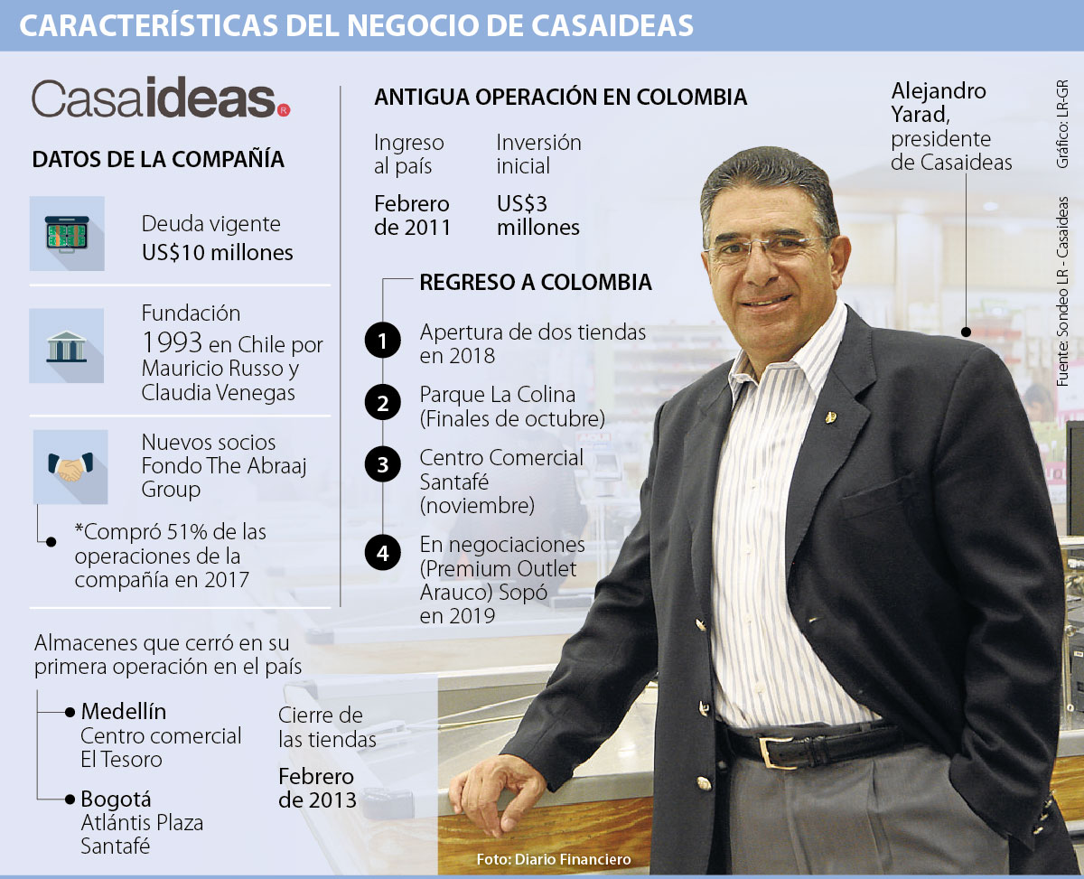 En febrero de 2019 se estarían cumpliendo seis años desde que Casaideas cerró su primera operación en Colombia. Para el consumo local y específicamente para el sector de decoración de hogar y diseño no es nueva la marca, pues ya tenía presencia previa con tiendas propias. En entrevista con Diario Financiero, Yarad dijo en enero que hay un plan de expansión para los siguientes cinco años que contemplaba la apertura de nuevos puntos y el reinicio desde Bogotá según evolucione la economía nacional en 2018.