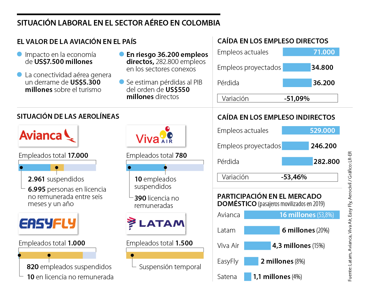 De acuerdo con la Asociación Internacional de Transporte Aéreo (Iata), 6.200 empleos directos y 282.800 indirectos están en riesgo en el país por la situación actual. LR pudo establecer que a 64,2% de los empleados directos de tres de las principales aerolíneas (Avianca, Viva Air y Easy Fly) que operan en el territorio nacional, les suspendieron los contratos o los mandaron a licencia no remunerada.