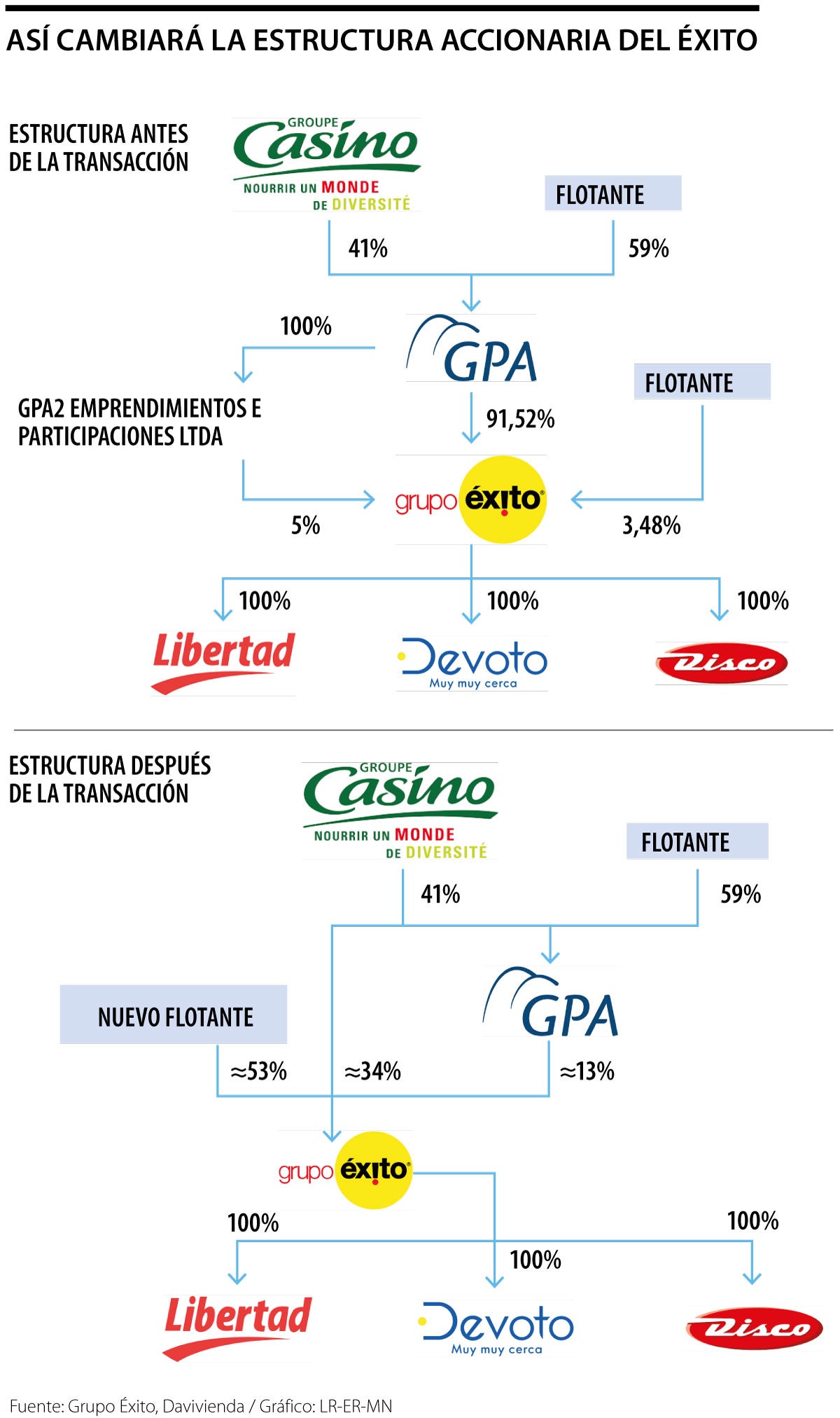 Hoy la Companhia Brasileira de Distribuicao (GPA) tiene 96,5% de las acciones del Éxito y sólo 3,48% están flotantes, por lo que es una especie que poco se mueve en el mercado. Con las transacciones que están en marcha, 83% del capital de la compañía se distribuirá entre los más de 50.000 accionistas de GPA, que pasarían a ser socios directos de la empresa antioqueña. Para hacerlo, recibirán las nuevas acciones a través de títulos listados en la bolsa de Nueva York y en la de Brasil.