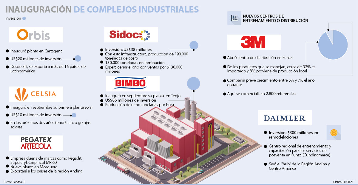 El leve crecimiento económico de 2017 no fue problema para que Celsia, Bimbo, Grupo Orbis y la Empresa Siderúrgica de Occidente (Sidoc) estrenaran nuevos complejos industriales en Colombia. Bajo una inversión, que superó los US$100 millones, las compañías enfilaron su estrategia para seguir creciendo en sus mercados con un alto volumen de producción.