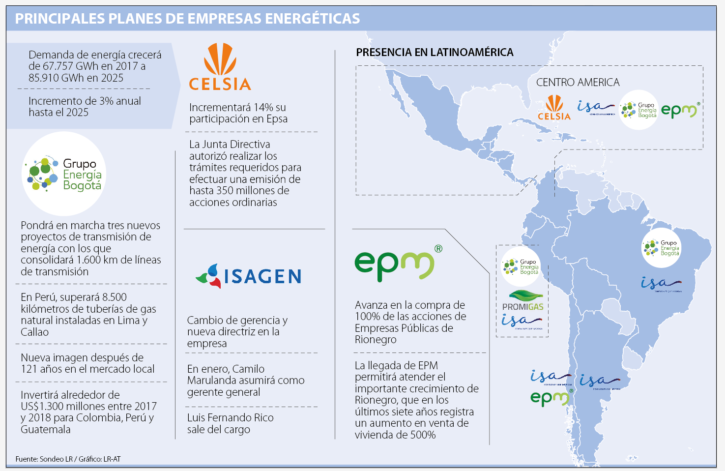 Una de las empresas con mayor movimiento es el GEB. La “holding” anunció que entre lo que queda de este año y 2018 invertirá alrededor de US$1.300 millones para fortalecer su operación en Colombia, Perú, Guatemala y Brasil. Además, según la compañía, pondrá en marcha tres nuevos proyectos de transmisión para alcanzar los 1.600 kilómetros en el país.