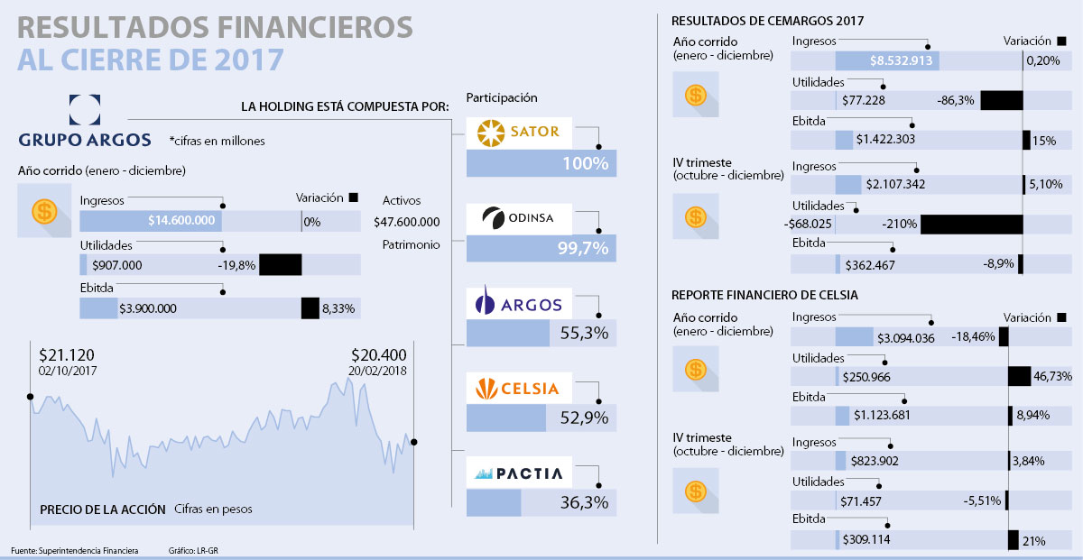 Los empresarios coinciden en que 2017 fue uno de los años más retadores para la industria y la economía colombiana. Pero, pese a las dificultades, al cierre del último trimestre, Grupo Argos logró reportar ingresos por $14,6 billones. La cifra, probablemente, la consolidará como la cuarta holding con más ventas después de Grupo Éxito, Ecopetrol y Grupo Sura.