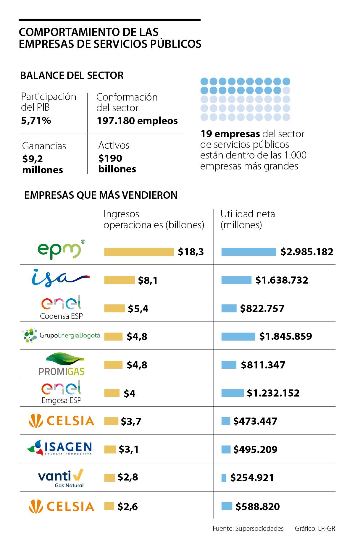 De acuerdo con los resultados de las 1.000 empresas más grandes del país en 2019, entregados por la Superintendencia de Sociedades, 19 compañías de servicios públicos tuvieron ingresos por $68,4 y utilidad neta por $12,6 billones.