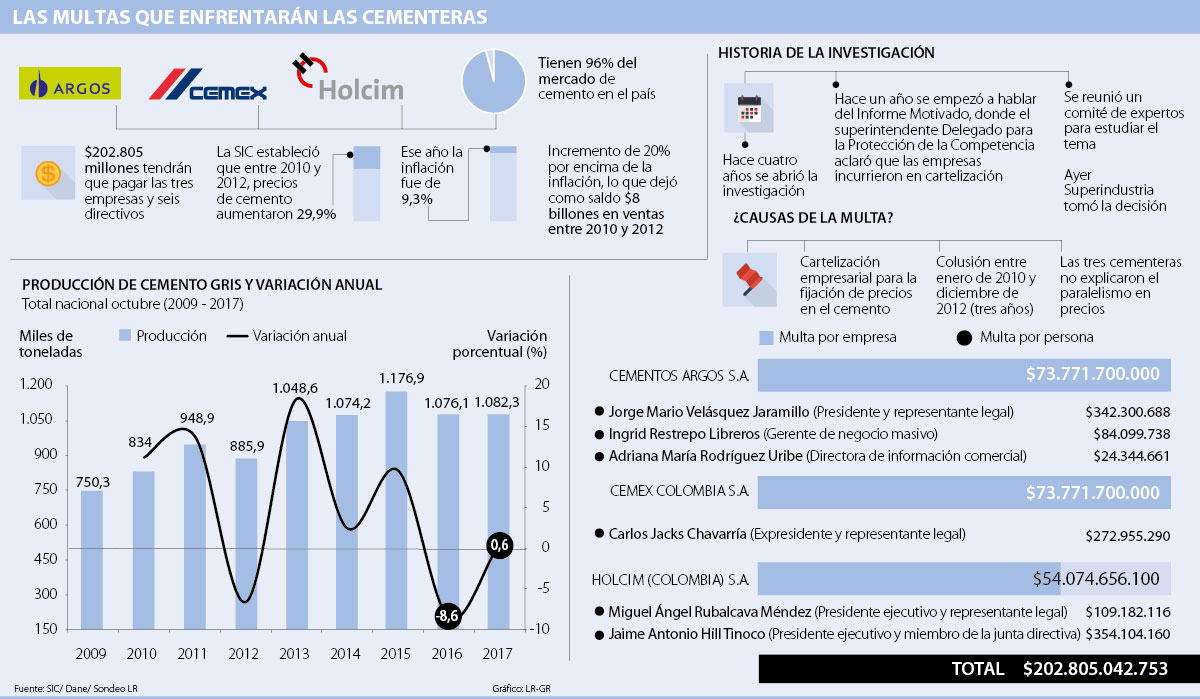 Después de un poco más de cuatro años de investigación, análisis de expedientes y comparación en los precios, Cemargos, Cemex, Holcim y seis altos directivos fueron sancionados por más de $202.805 millones por la Superintendencia de Industria y Comercio. La razón: cartelización empresarial para la fijación de los precios en el periodo 2010-2012.