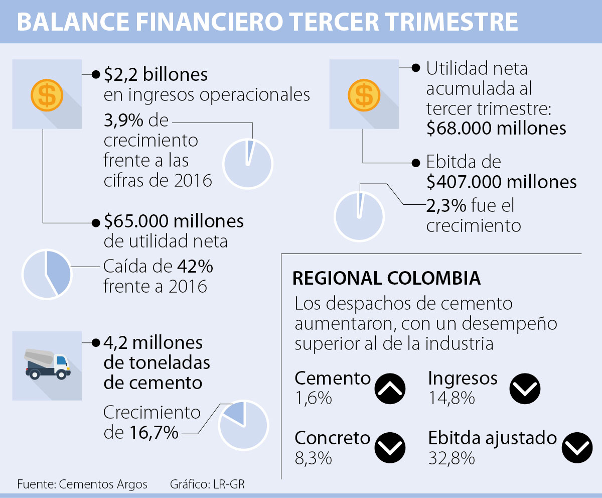 Al cierre del tercer trimestre del año el balance financiero de Cementos Argos, filial del Grupo Argos, es positivo. De acuerdo a la información publicada en la Superintendencia Financiera, en estos tres últimos meses la compañía generó ingresos por $2,2 billones, lo que le permitió un crecimiento de 3,9% frente a las cifras de 2016.
