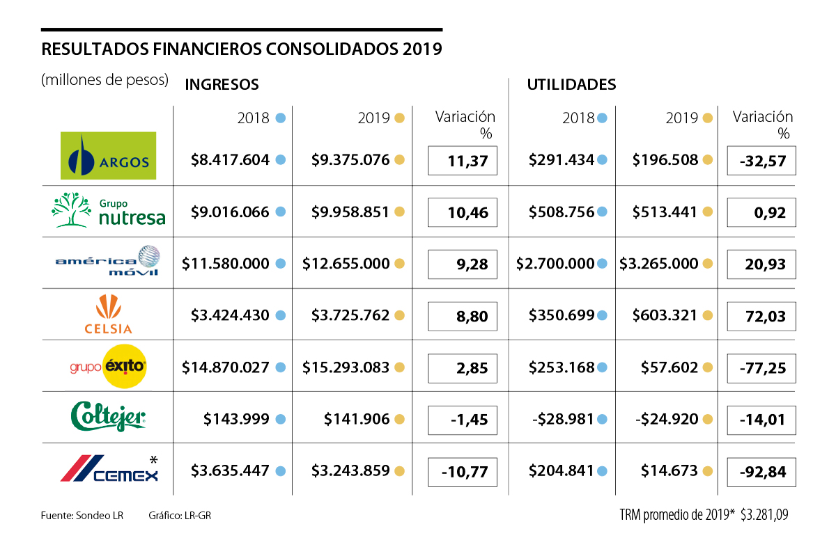Al cierre de esta edición, Cementos Argos, Grupo Nutresa, América Móvil, Celsia, Grupo Éxito, Coltejer y Cemex habían reportado cómo les fue en 2019.